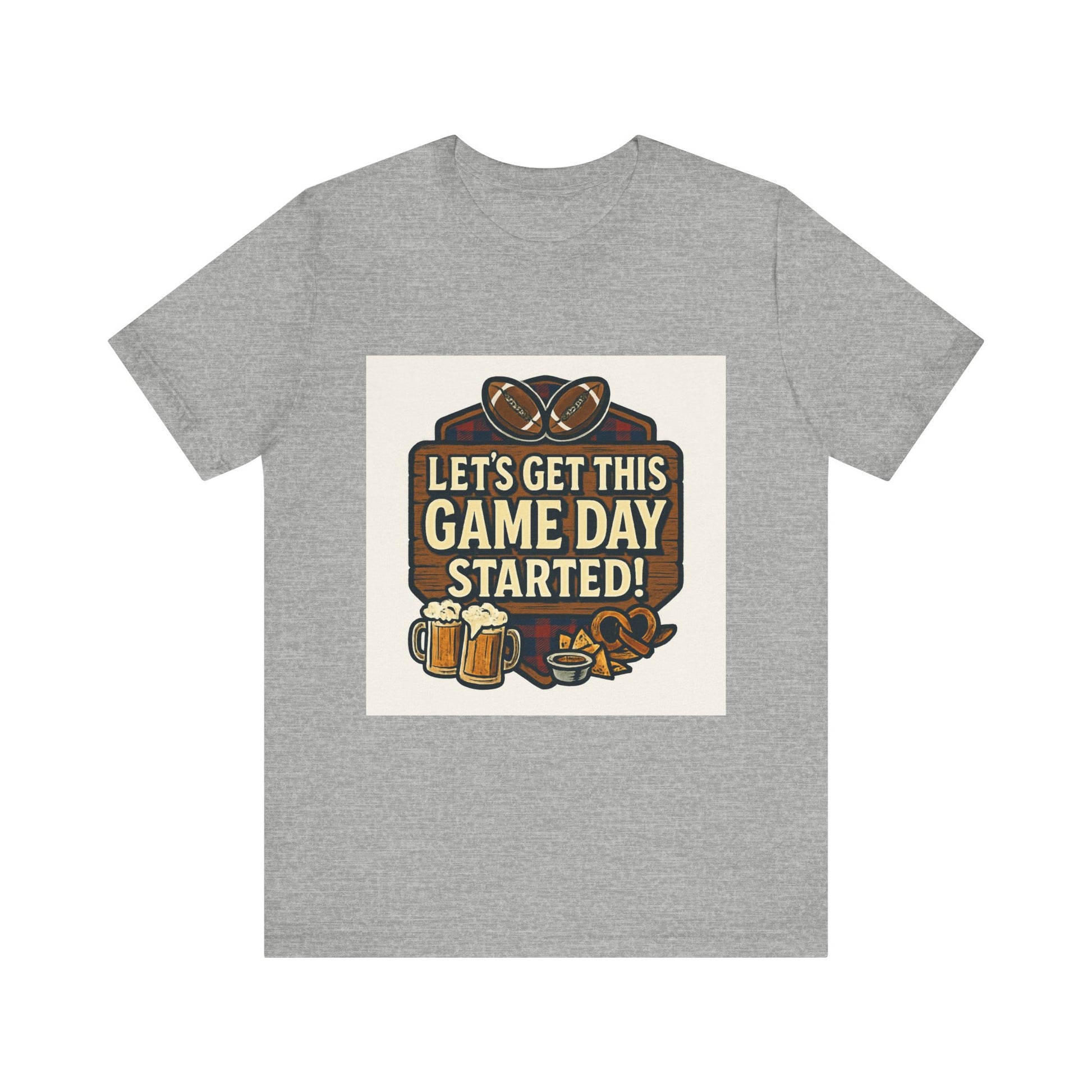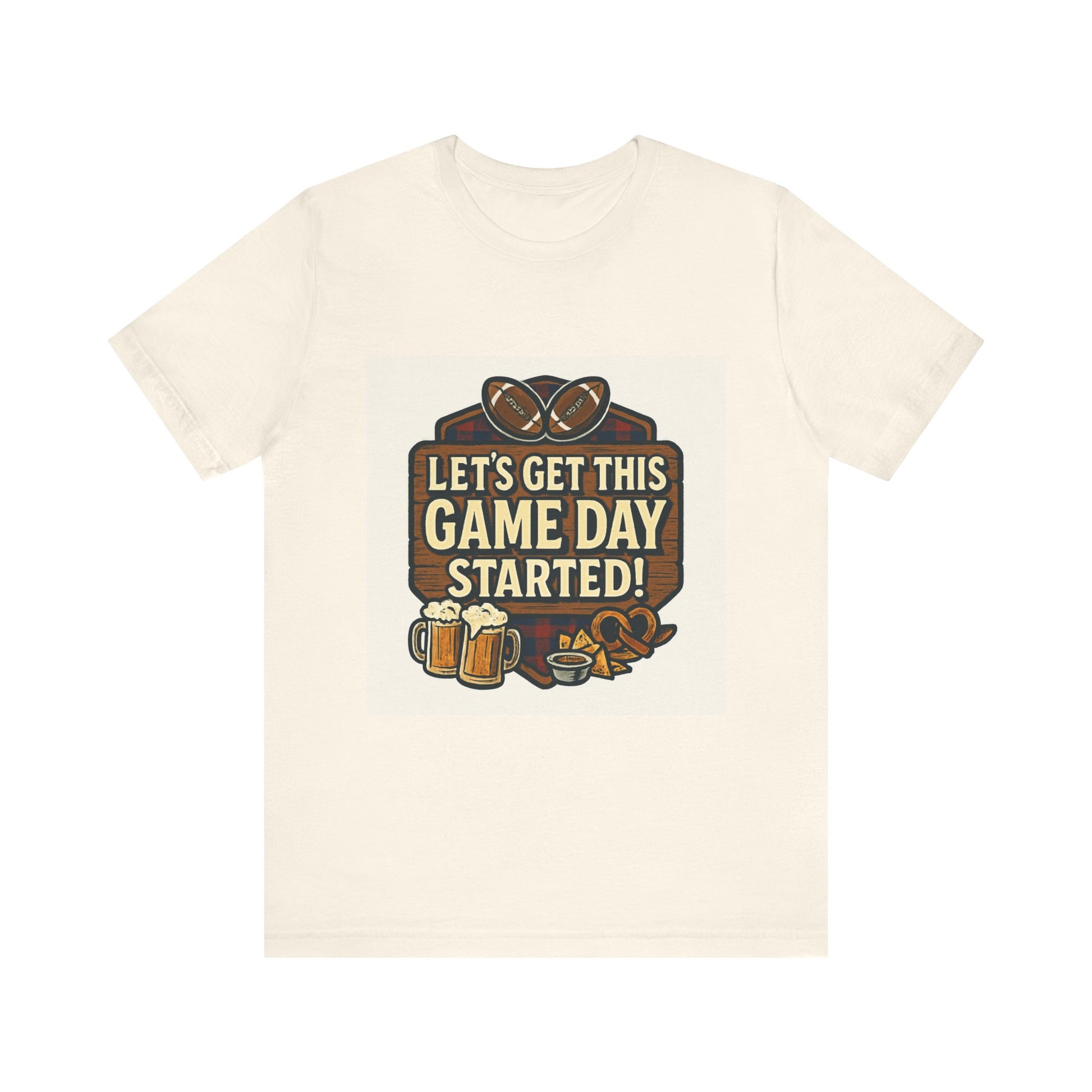 Featuring a classic plaid shield and the bold phrase "Let's Get This Game Day Started!," this design captures the excitement of football season. It's complete with all the essentials: a pair of footballs, refreshing mugs of beer, and a bowl of delicious nachos.